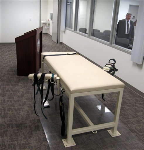 The execution chamber at the Idaho Maximum Security Institution is shown on Thursday, Oct. 20, 2011 as Security Institution Warden Randy Blades look on in Boise, Idaho. Paul Ezra Rhoades, who was convicted of killing three people in Idaho Falls and Blackfoot in 1988, is scheduled to be executed by lethal injection on Nov. 18, 2011. (AP Photo/Jessie L. Bonner)