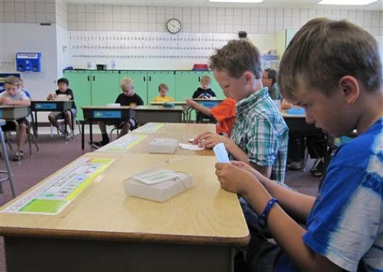 In this photo taken May 9, 2012, Dillon Elledge, 8, right, and Brody Kemble, 7, second from right, work with flash cards in their all-boys classroom at Middleton Heights Elementary in Middleton, Idaho. Middleton is believed to be the only public school in Idaho offering all-boy and all-girl classrooms, though the movement is widespread in other states and is now being targeted by the American Civil Liberties Union in a bitter struggle over whether single-gender learning should be continued. (AP Photo/Jessie L. Bonner)